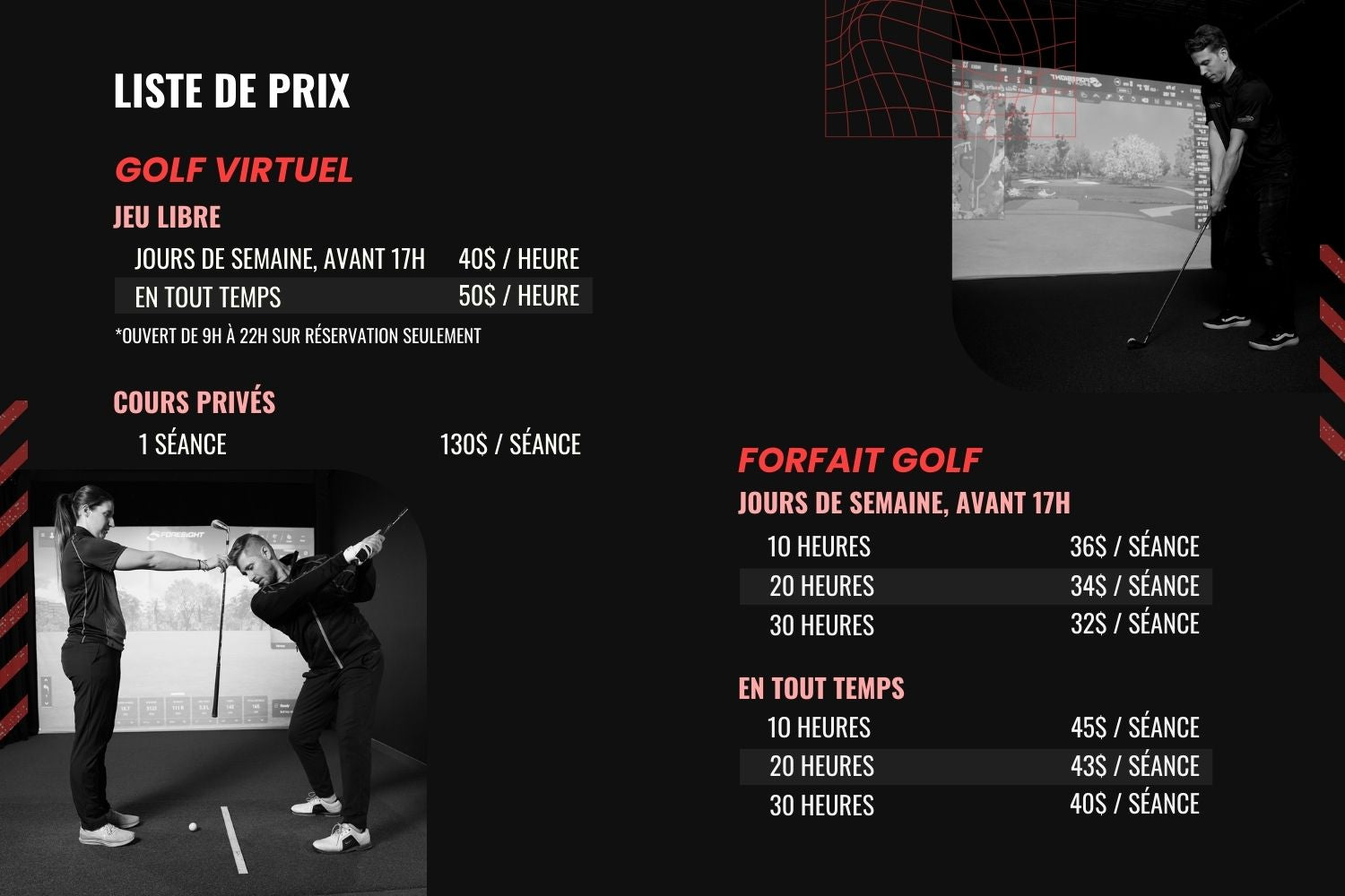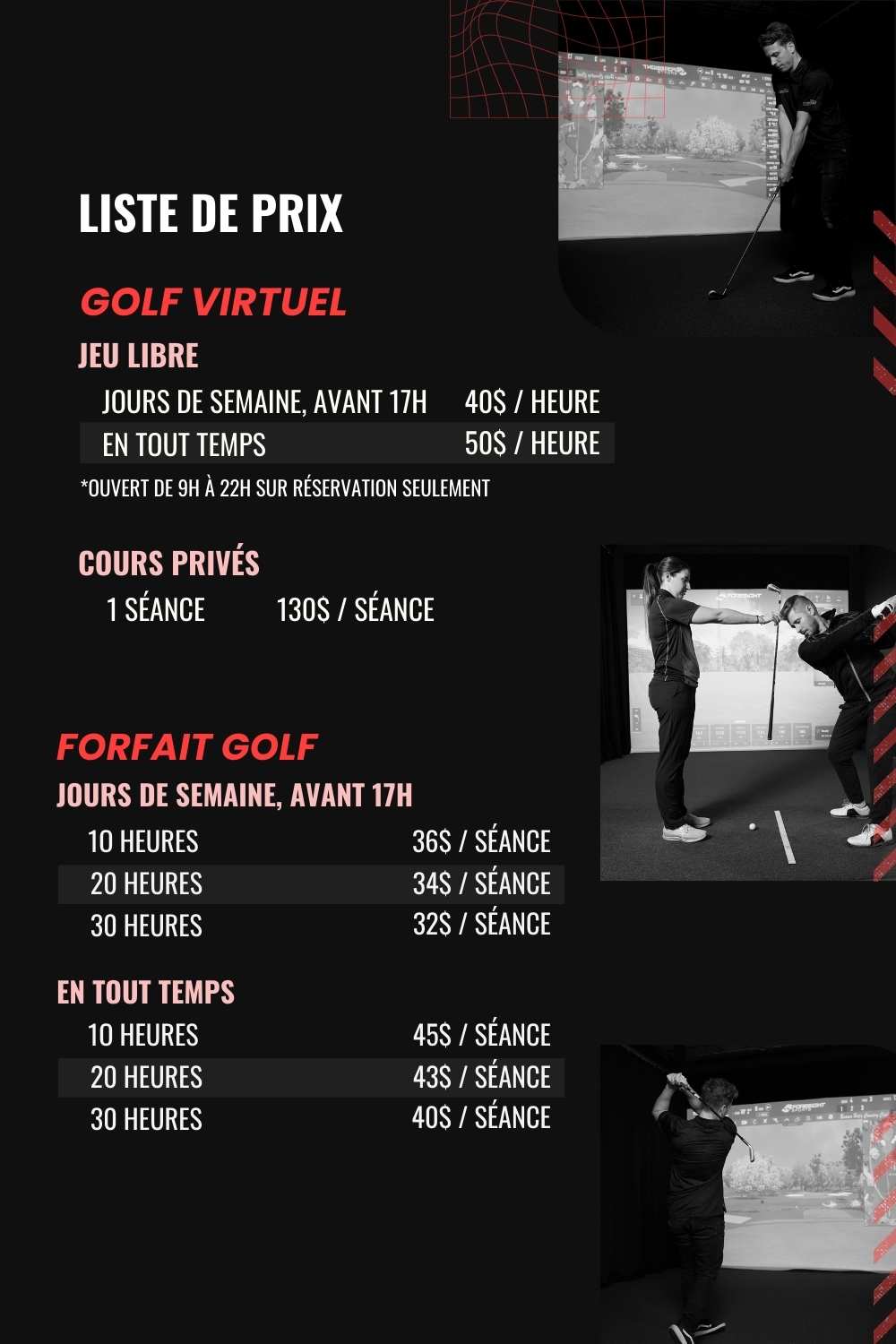 Nous proposons également des forfaits pour devenir membre. En devenant membre, vous accédez à des prix avantageux et à d’autres privilèges, notamment la possibilité de réserver en ligne et de profiter d’une plage horaire élargie; 8h à 22h du lundi au dimanche).